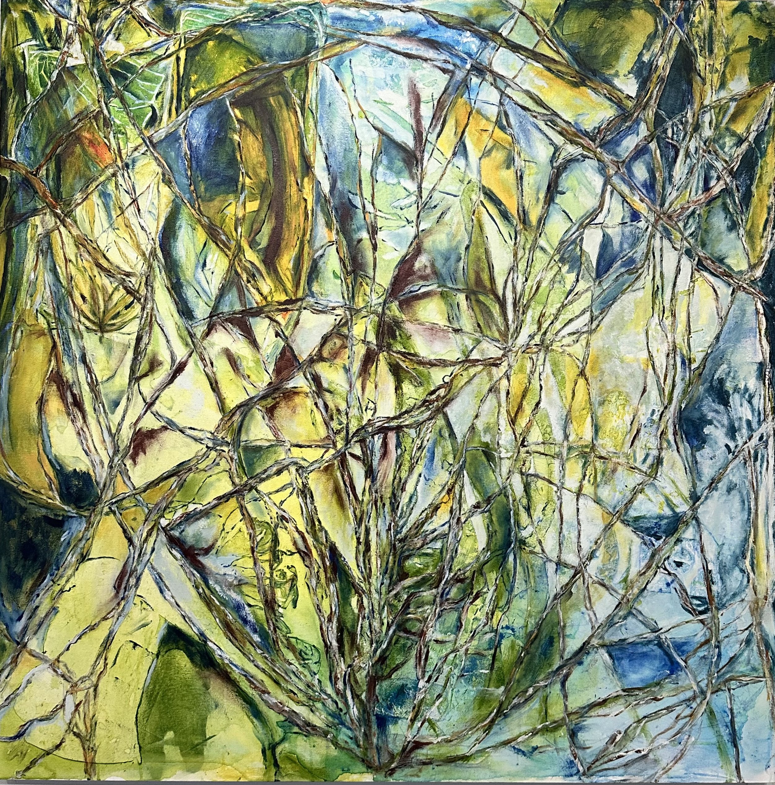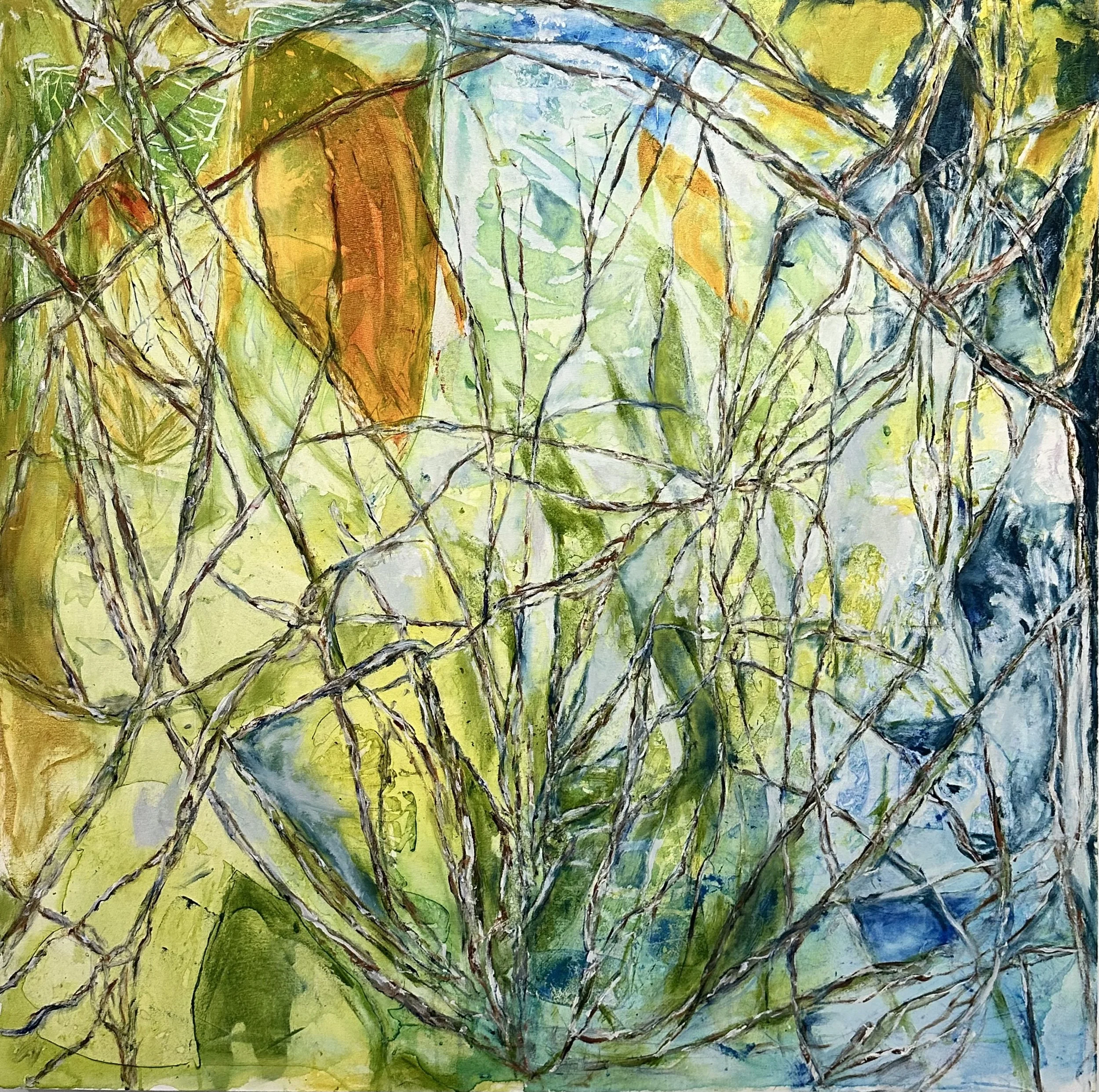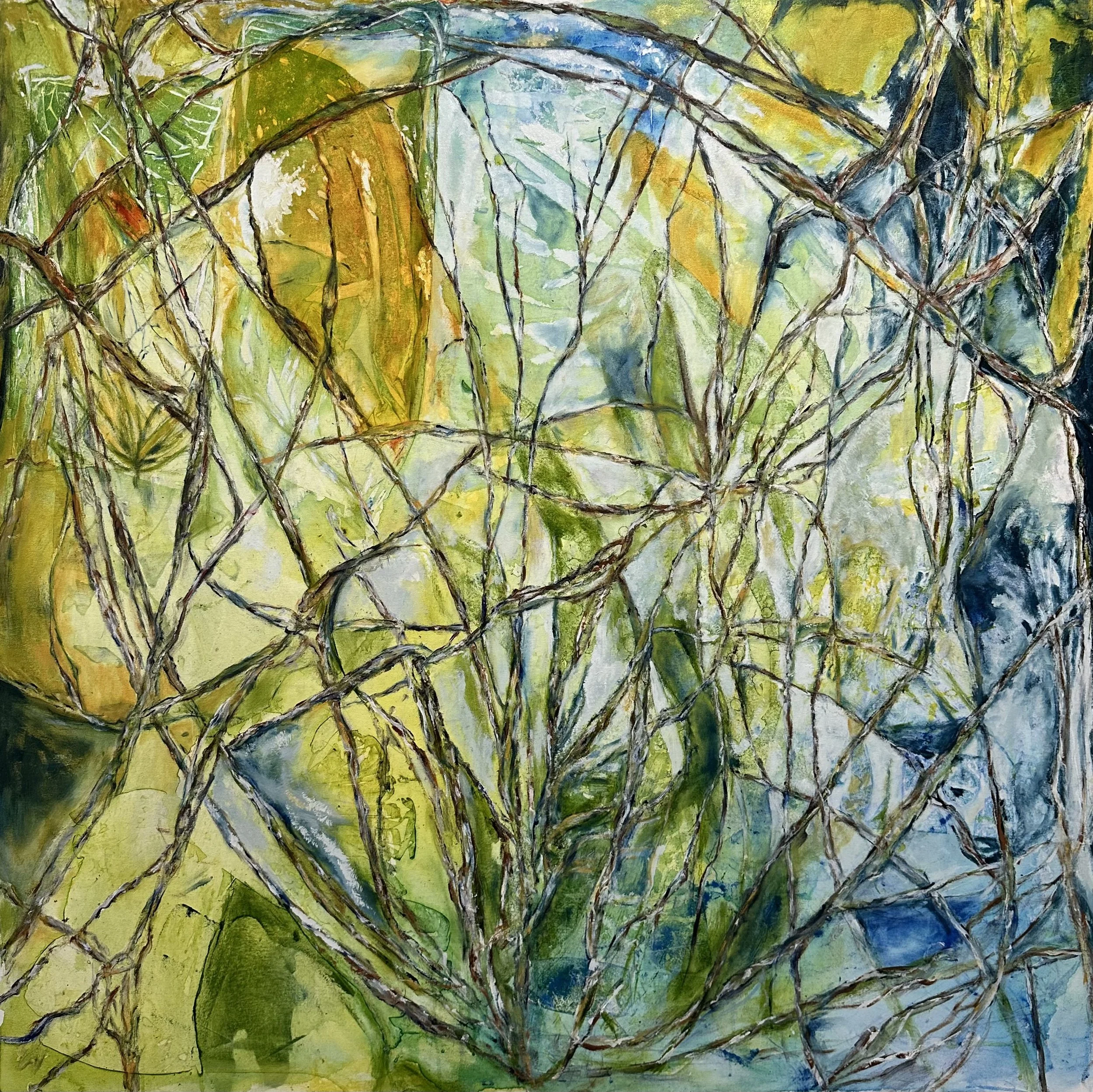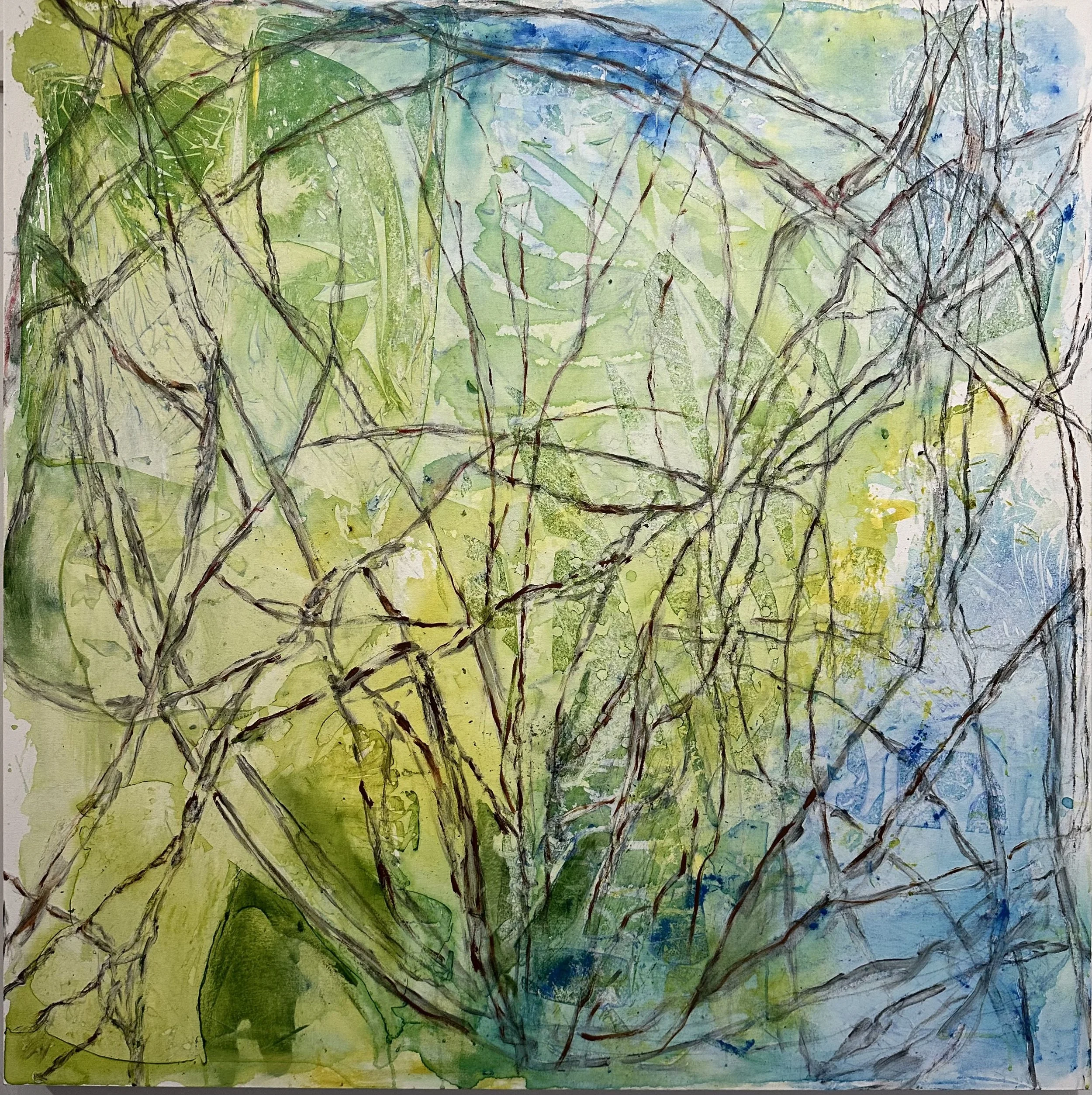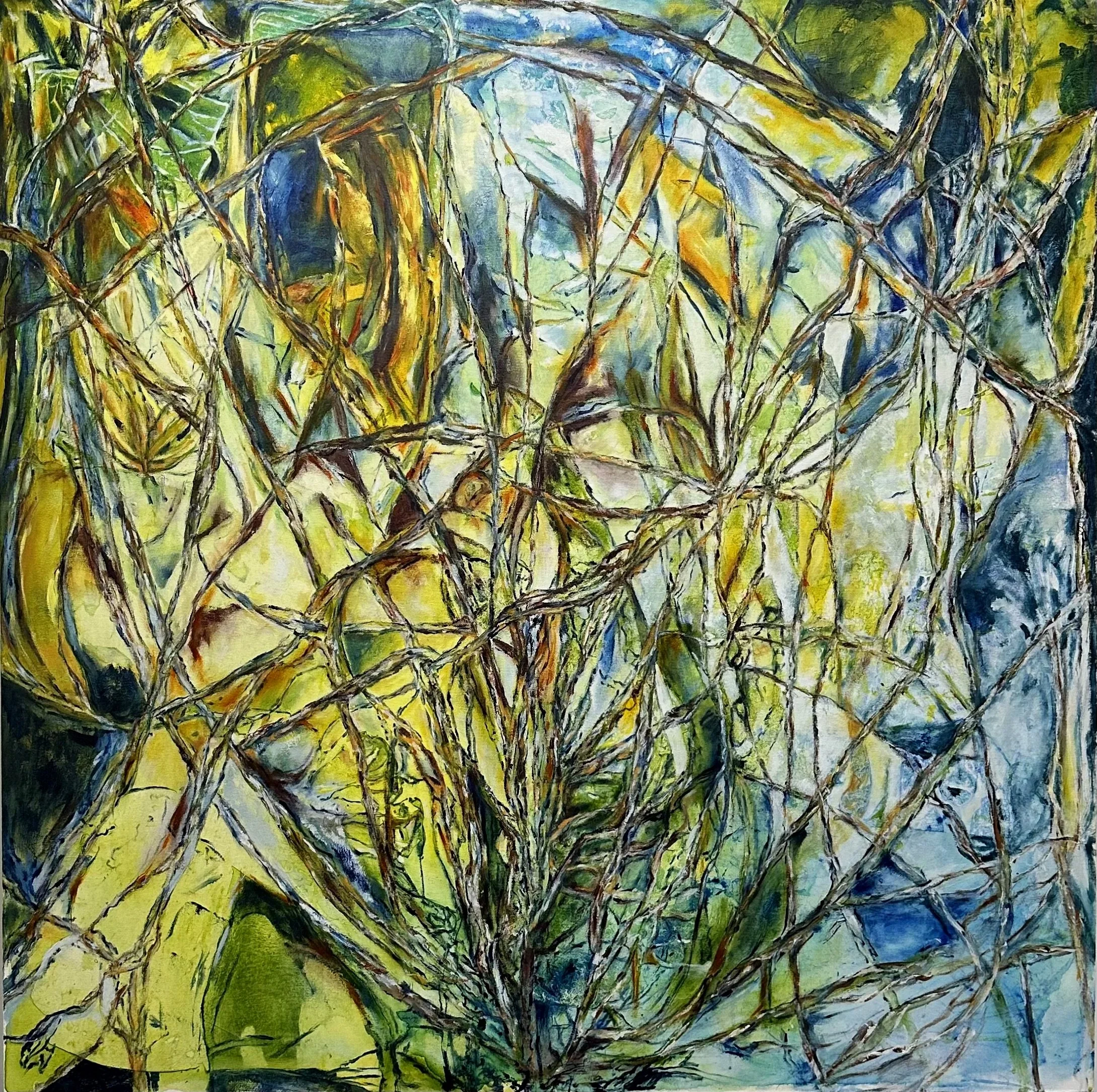 That single decision changed everything that followed. I introduced the color slowly. First, as washes, light and tentative, I was feeling for the temperature of what wanted to come into the world. Green and yellow, and that particular blue that lives in shadows. The branches are still present, still themselves, but now they are beginning to exist inside a world rather than just describing one.